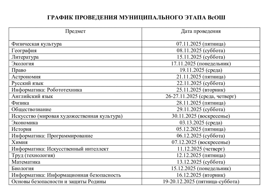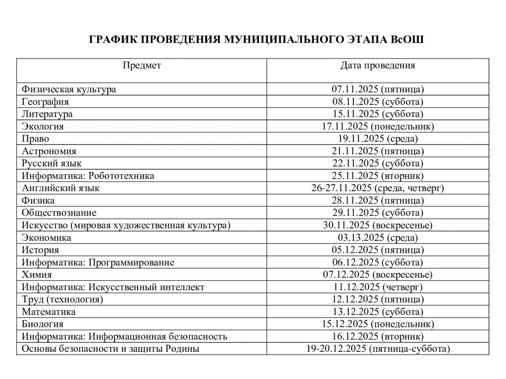 ГРАФИК проведения муниципального этапа ВсОШ в 2025/2026 учебном году