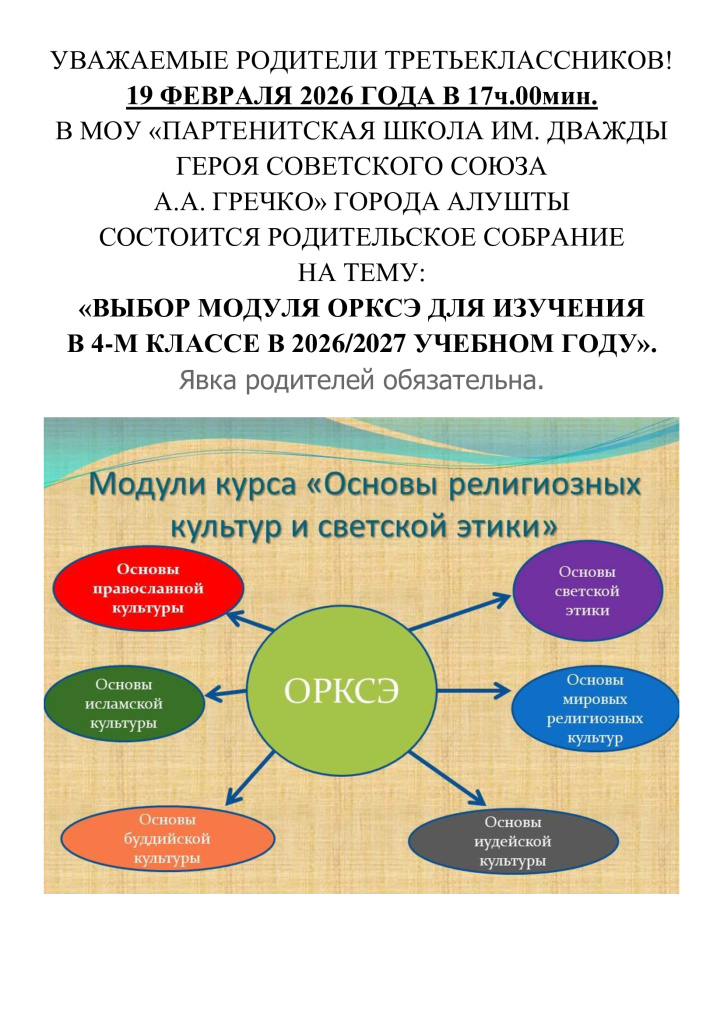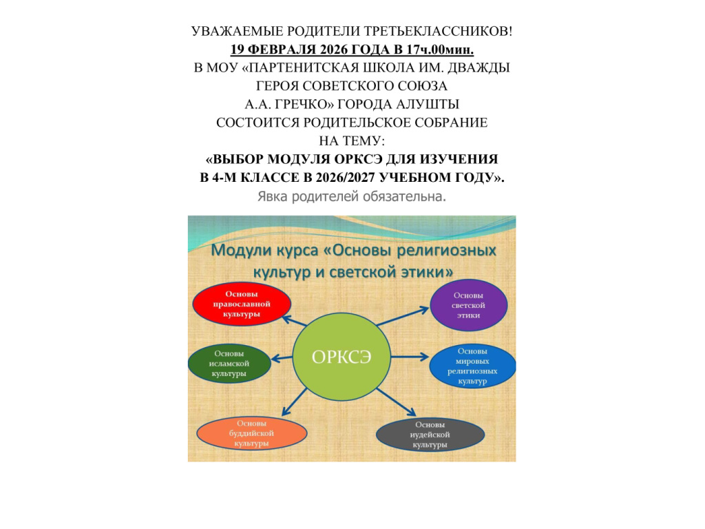 Присутствие на собрании, по крайней мере, одного из родителей (законных представителей), и заполнение личного заявления — обязательно. Отказ от изучения любого из шести модулей комплексного курса не допускается и рассматривается как препятствование получению ребенком общего образования в соответствии с законодательством Российской Федерации.